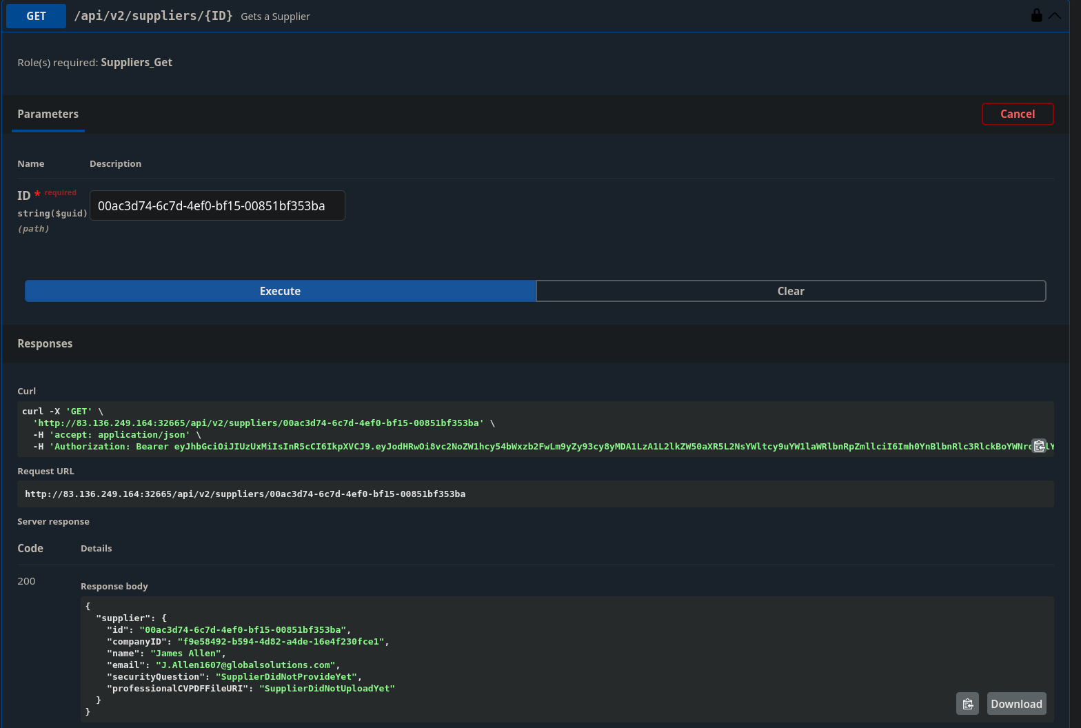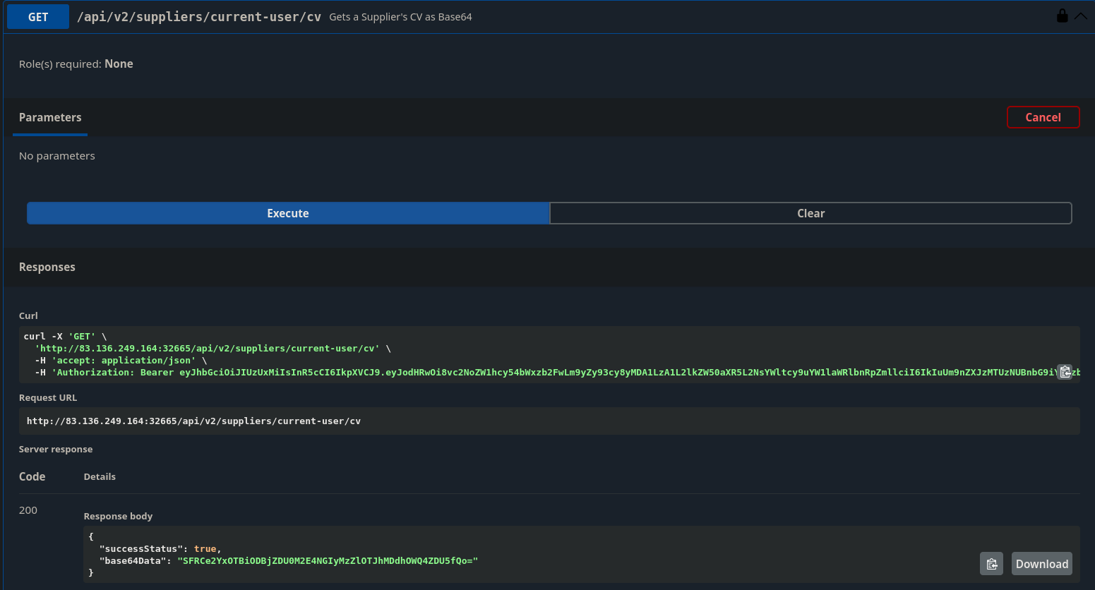 Now I can use the /api/v2/suppliers/current-user/cv endpoint to get my ‘CV’ as a b64 encoded string