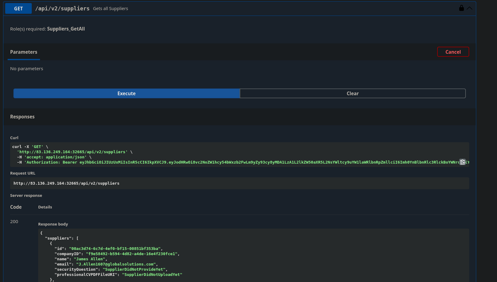 To start, it seems that the roles for an account authenticating as a customer are a bit permissive. It doesn't make sense for customers to be able to list all of the suppliers. This endpoint also leaks some sensitive information about the suppliers. We can see the name and email address of all the suppliers so a customer could reach out to them directly instead of using the e-commerce platform.
