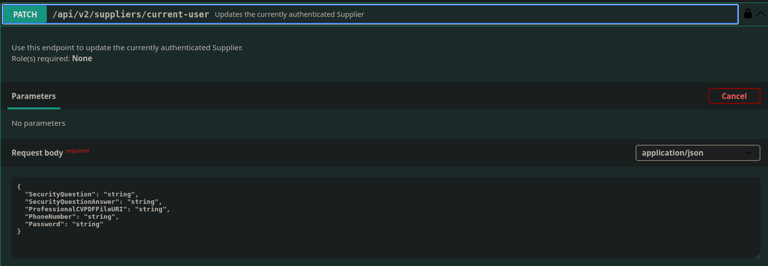 I go to the PATCH endpoint /api/v2/suppliers/current-user