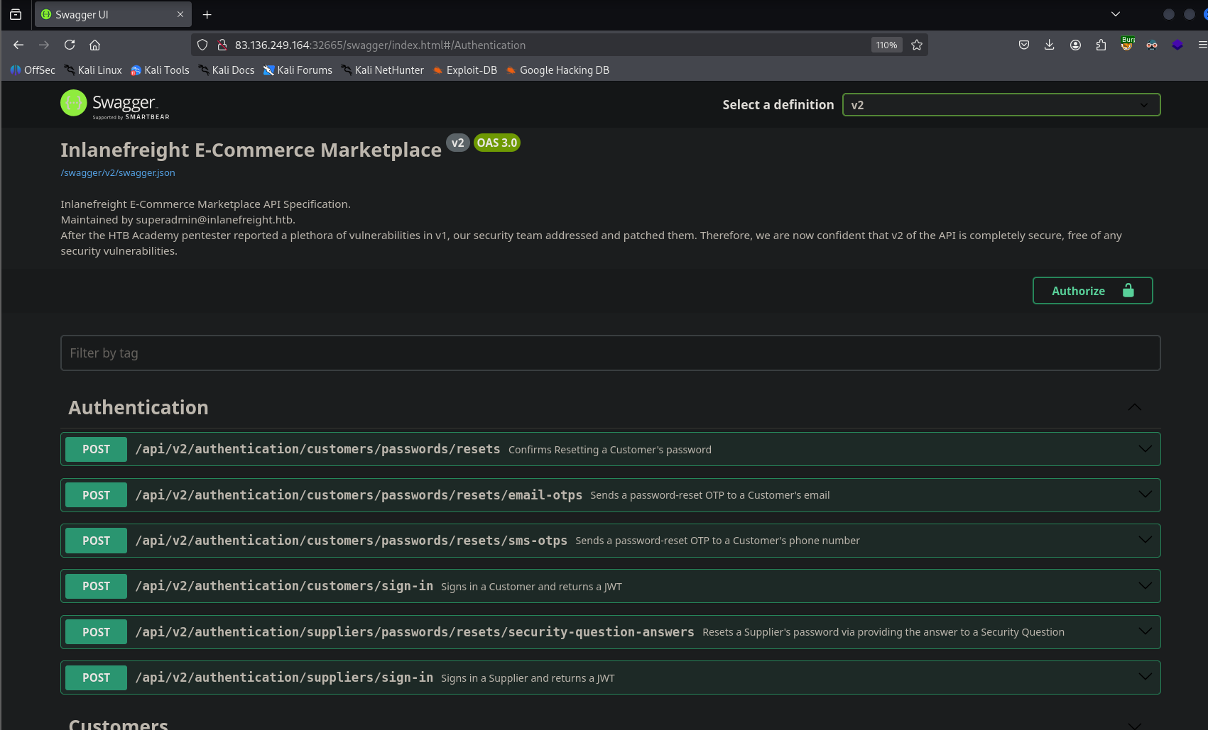 However, new junior developers have implemented additional functionalities in v2, and the admin is concerned that they may have introduced new vulnerabilities. Assess the security of the new web API version and apply everything you have learned throughout the module to compromise it.